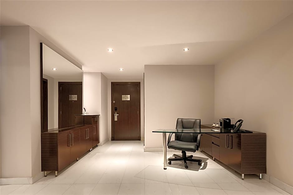 This room includes lounge access with the below benefits: •Complimentary continental breakfast buffet style from 07:00 to 10:30 •Complimentary tea, coffee, juices and soft drinks are available at the lounge from 07:00 to 23:00. •Children are welcomed with their parents into the lounge throughout breakfast time and up till 12:00 noon only. •Complimentary cocktails, local beer and wine as well as canapés are served daily from 17:30 to 20:00 at the lounge •Unlimited free WIFI at the lounge. •Complimentary use of the lounge board room for 2 hours per day (pre booking and subject to availability). •Complimentary pressing service for three items upon arrival and 20% discount on laundry during your stay. •Complimentary local land line calls in your room. •Late check out till 16:00 (subject to availability). •Personalized check-in and check-out.
