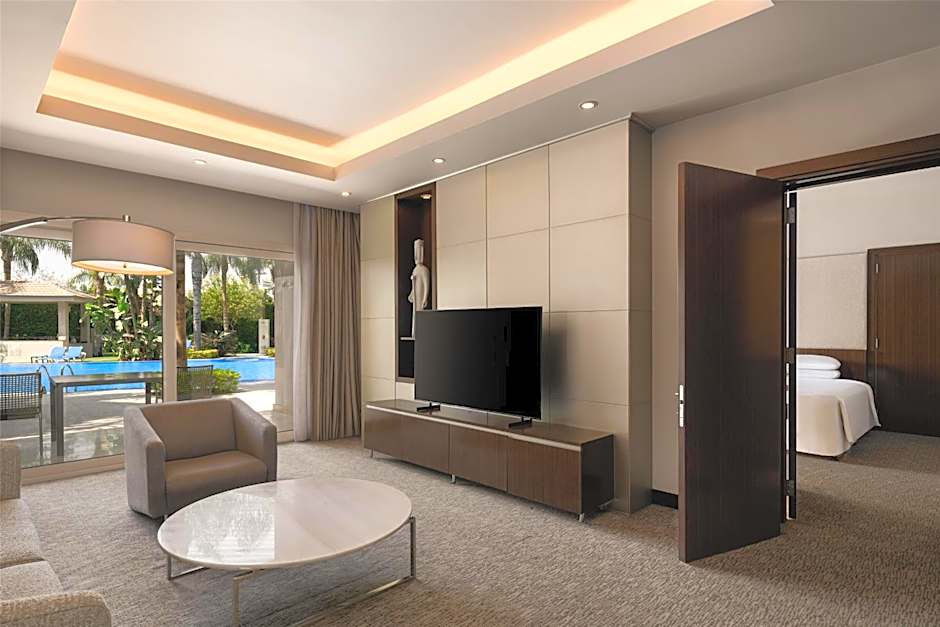 This double room is located at the Lake House - The Club, adjacent to the main building. It features a fully furnished private terrace overlooking the swimming pools and greenery, king-size bed, flat-screen TV and bathrobe.
